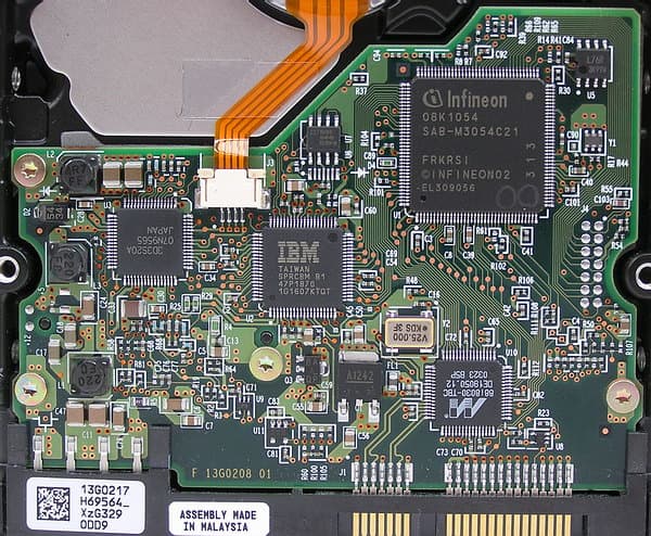 Зато плата контроллера изменилась кардинально. Применение новой микросхемы контроллера производства Infineon (совместная разработка с IBM/Hitachi) позволило не только перейти на использование нового интерфейса, но и заметно сократить площадь платы контроллера — прежние три микросхемы заменила одна — контроллер Infineon (на фото).