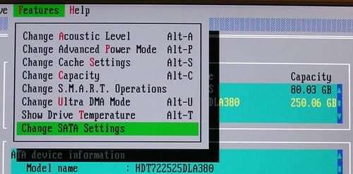 изменять скорость и режим работы UltraATA-интерфейса (кстати, эти режимы можно менять и для SATA-диска T7K250!), полезную емкость диска и режим акустики, контролировать температуру. Начиная же с версии 1.97 утилита позволяет переключаться между скоростными режимами интерфейса SerialATA (только для дисков Hitachi, для дисков других вендоров не работает) — 150 и 300 Мбайт/с: