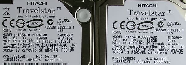Итак, в этом тестировании принимают участие две старшие 100-гигабайтные модели серии Hitachi Travelstar 5K100 — HTS541010G9SA00 и HTS541010G9AT00 с интерфейсом Serial ATA и UltraATA/100 соответственно (маркировка испытанных нами накопителей Hitachi показана на фото).