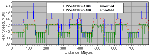 Очевидно, что график для PATA-модели 5K100 имеет четко выраженную периодичность колебаний скорости, причем полочки с постоянной скоростью соответствуют 4 головкам (2 с наивысшей скоростью 44 Мбайт/с, одна со скорстью 42,5 Мбайт/с и еще одна с низшей скоростью 39,8 Мбайт/с в начале диска). Сдругой стороны, для нашего экземпляра SATA-модели 5K100 та же периодичность изменения скорости отвечает более низким значениям скорости — две головки на 42,5 МБайт/с и две на 39,8 Мбайт/с в начале диска. Таким образом, адаптивное форматирование в этих дисках никуда не делось и присутствует в явном виде, хотя период чередования головок в трансляторе физического пространства в логическое явно уменьшился, поэтому и общий график стал более гладким. Кстати, подобная тенденция ранее наблюдалась нами и в дисках других производителей, использующих адаптивное форматирование — Samsung, Seagate и SCSI-моделях Maxtor. Интересно и то, что у Hitachi также прослеживается всего несколько (немного) заданных уровней плотности/скорости записи, на которые осуществляется форматирование каждой поверхности магнитных пластин в зависимости от характеристик головок и магнитного покрытия: по этим нашим измерениям можно предположить, что таких уровней 4-5.