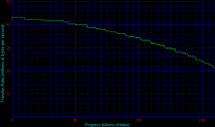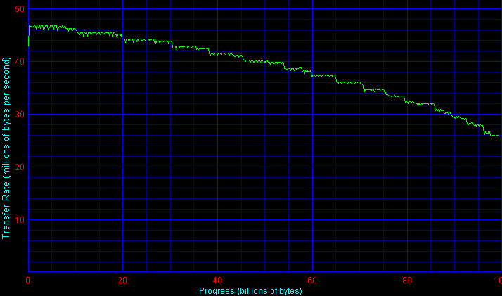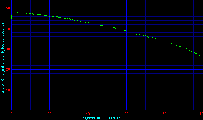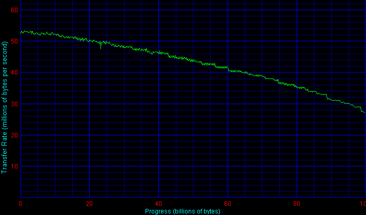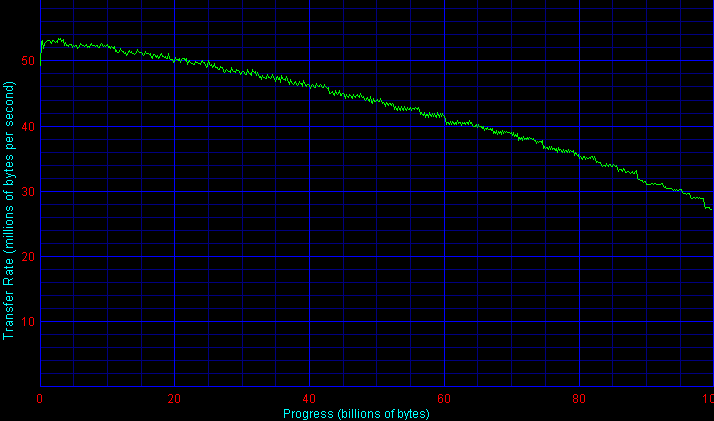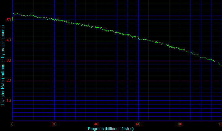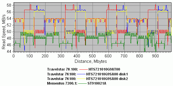 Как и ожидалось, 100-гигабайтные винчестеры Hitachi 7K100 с большим преимуществом опередили по скорости линейного чтения всех своих предшественников и конкурентов, показав среднюю скорость в начале диска на уровне 53 Мбайт/с.