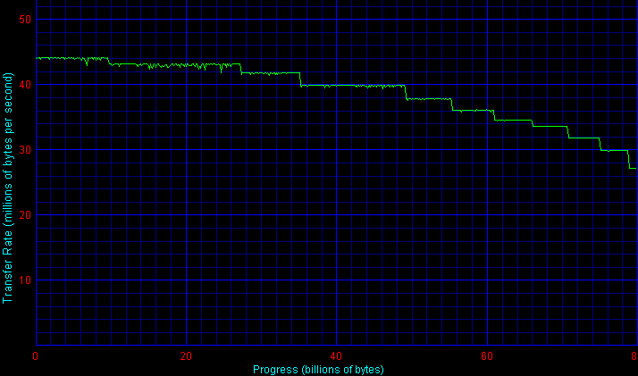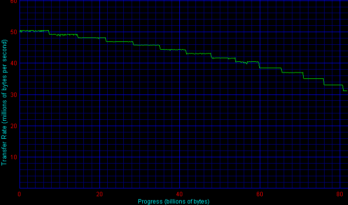 По скорости линейного доступа диски Hitachi Deskstar 7K80 находятся в общем русле накопителей с пластинами 80 Гбайт — максимальная скорость около 60 млн. байт/с, средняя по всему диску — в районе 45-50 млн. байт/с. Признаки адаптивного форматирования, отчетливо видимые на графиках дисков Samsung или ноутбучных винчестеров Hitachi, у 7K80 на графиках не прослеживаются. Более того, графики для нескольких исследованных дисков этой серии (показаны два, но прошло испытания большее количество) в точности повторяют друг друга (по зонам и скорости), так что уверенно говорить о наличии адаптива на основе этой информации не приходится, тем более что в спецификациях этих дисков приводится фиксированная зонная карта. Не могу не отметить, что график для 7K80 поразительно похож на график для старших дисков серии Deskstar 7K250 на пластинах той же емкости.