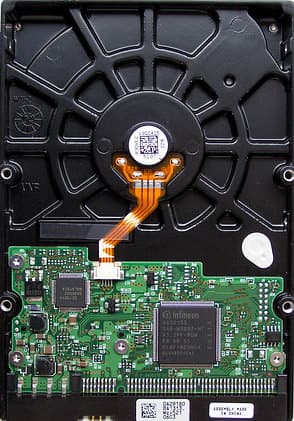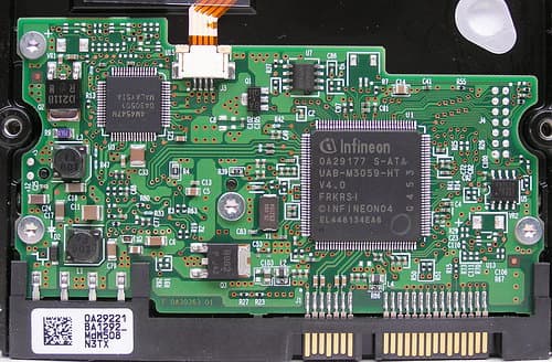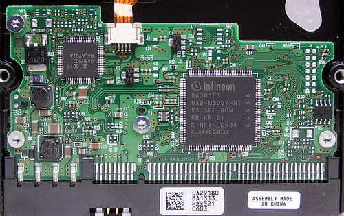и разные микросхемы сигнал-процессора от Infineon — M3057 для UATA-модели и M3059 для SATA-модели (платы контроллеров фактически те же, что и у дисков Hitachi Deskstar T7K250).