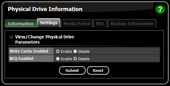 Кеширование в драйверах, по нашим наблюдениям, не оказало сколько-нибудь заметного влияния на производительность массивов (выше приведены результаты тестов без кеширования), а вот NCQ немного повлияло на результаты (см. ниже).