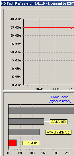 Другое дело — жесткие диски. Их модели были выбраны нами таким образом, чтобы потенциальная скорость винчестера перекрывала возможности USB 2.0. Измеренная (в программах HD Tach RW 3.0 и Everest 5.50) скорость интерфейса как для встроенного в док-станцию винчестера, так и для подключенного к ней по USB диска составила около 35 МБ/с, что близко к предельным значениям, демонстрируемым дисками при подключении к USB-портам материнской платы с ICH10. Сходные значения скорости продемонстрировали накопители и при потоковом чтении/записи файлов в программе ATTO Disk Benchmark 2.41 (см. диаграмму).