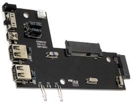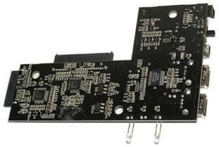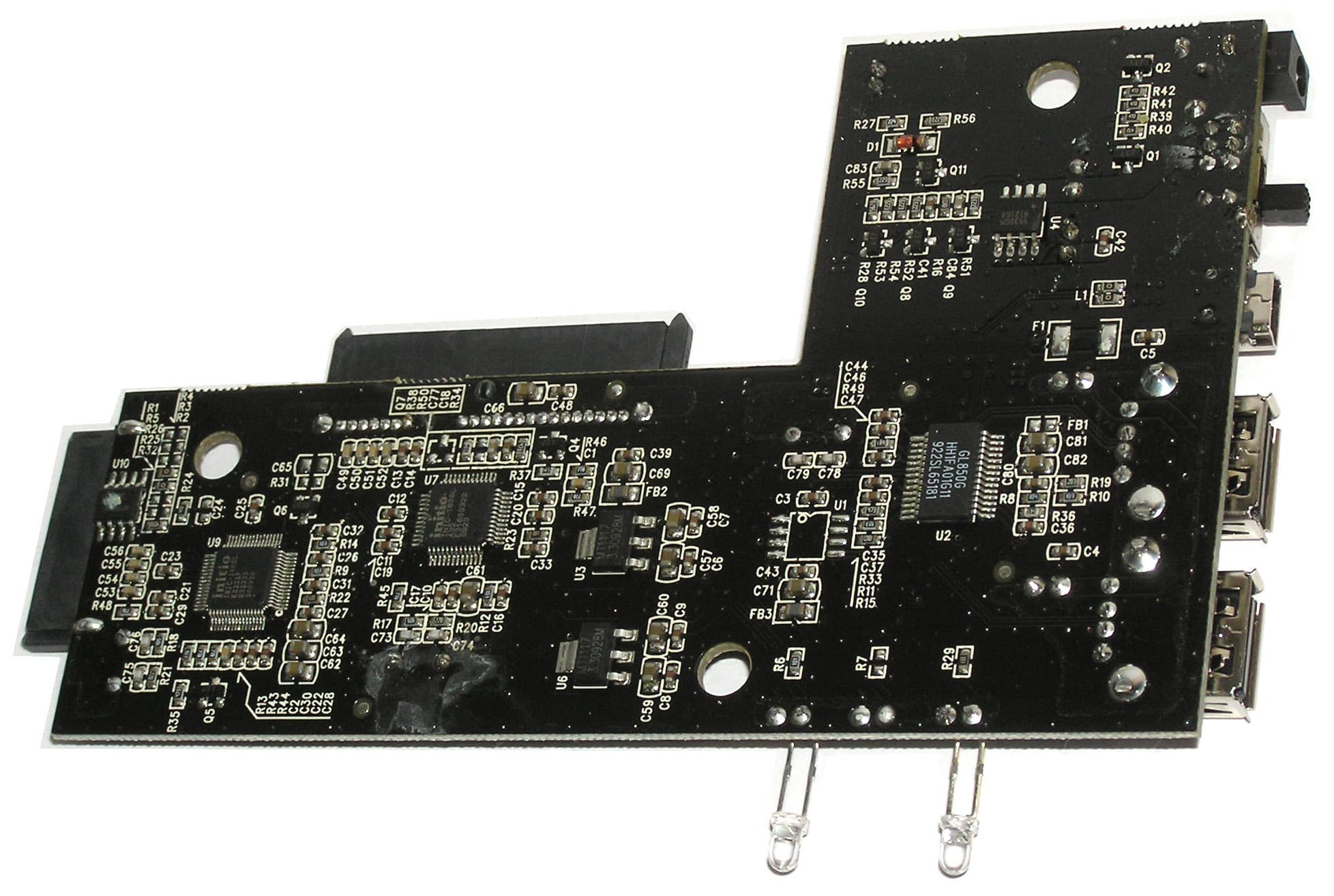 Сердцем док-станции является внушительная по размерам плата контроллеров: USB-линк с ПК подается на 4-портовый USB-хаб Genesys Logic GL850G и уже от него сигнал идет на два внешних порта USB и два преобразователя интерфейсов USB-SATA на чипах Initio INIC-1605L и INIC-1608L, к которым и подключаются устанавливаемые в док-станцию винчестер и DVD-привод соответственно. Производитель заявляет «нативную» поддержку док-станции во всех более или менее современных операционных системах без необходимости установки сторонних драйверов.
