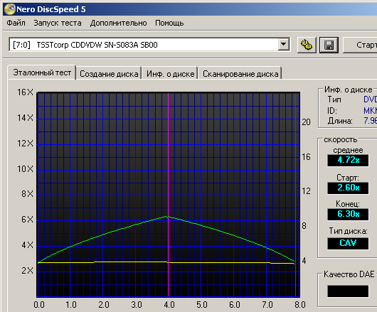 Нынешние ноутбучные оптические приводы, как правило, работают на скоростях, существенно меньших, чем предельные возможности интерфейса Hi-Speed USB, поэтому наши тесты установленного в док-станцию IB-DK210 привода SN-S083A при помощи программы Nero DiscSpeed 5 (см. скриншот) лишь подтвердили значения, демонстрируемые им при прямом (SATA) подключении к материнской плате компьютера. Пиковая потоковая («Интерфейс») скорость привода в этом тесте составила 22 МБ/с.
