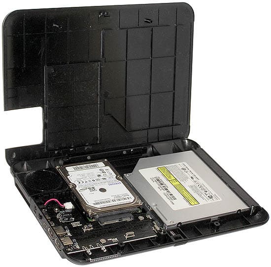 Внутрь корпуса IB-DK210 можно установить 2,5-дюймовый ноутбучный жесткий диск толщиной 9,5 мм с интерфейсом Serial ATA (к сожалению, максимально емкие модели толщиной 12,5 мм туда не помещаются), а также тонкий ноутбучный же оптический привод стандартной толщины 12,5 мм (также SATA). Увы, если вдруг захочется вместо оптики поставить внутрь этой док-станции второй винчестер, сходу это сделать не получится, поскольку «слимовый» DVD-привод и, соответственно, коннектор для него в док-станции имеют разъем Mini-SATA (с укороченной относительно «винчестерного» SATA-разъема секцией питания). То есть придется, как минимум, искать очень редкий переходник.