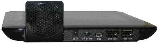 Разъемы для всех внешних подключений расположены по левую руку от скошенной передней грани корпуса, если передом считать защелку открывающейся верхней крышки и расположенные слева от нее два голубых светодиодных индикатора работы док-станции — подачи питания и активности дисков. Среди этих разъемов: входной Mini-USB (для подключения к ПК комплектным кабелем длиной 40 см), два выходных порта USB (от хаба), трехпозиционный переключатель Off/On/Fan (включение питания док-станции и работы вентилятора) и коаксиальный разъем питания +5 В. С правого торца док-станции находится лоток оптического привода.