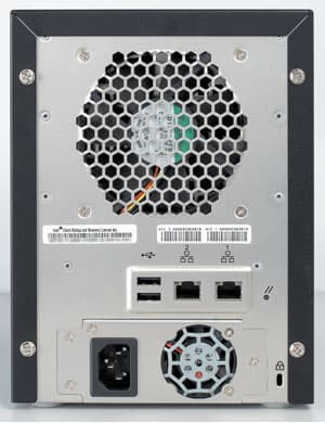На передней панели расположены дисковые корзины, индикаторы активности сети, дисков и пара служебных, кнопка включения питания. С обратной стороны можно увидеть два вентилятора, разъем сетевого питания, сетевые и USB-порты и кнопку сброса пароля и сетевых настроек.