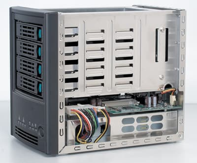 SS4000-E представляет собой одноплатный специализированный компьютер на базе процессора Intel IOP80219 с частотой 400 МГц, корзину для четырех SATA жестких дисков с возможностью горячей замены и блок питания в одном компактном (11,5×24×12 см) корпусе. Прошивка на базе ОС Linux хранится во Flash-памяти (конечно, тоже производства Intel), оперативная память представлена одним модулем DDR объемом 256 МБ. Дисковые контроллеры сделаны на базе чипа Intel 31244. В системе присутствует два гигабитных сетевых интерфейса и два порта USB 2.0 для подключения внешних устройств. Для охлаждения используется 90-миллиетровый вентилятор, расположенный за дисковой корзиной, и еще есть небольшой кулер в блоке питания. Мощность последнего составляет 200 Вт, чего вполне достаточно для надежного питания четырех современных жестких дисков. Предел объема для них составляет 500 ГБ, однако, скорее всего, при появлении новых, более емких, моделей будет достаточно обновления прошивки, чтобы система смогла с ними работать.