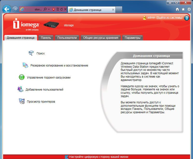 Он имеет пять вкладок — «Домашняя страница», «Панель», «Пользователи», «Общие ресурсы хранения» и «Параметры». На первой из них собраны несколько популярных ссылок, особенно интересно выглядят «Поиск», позволяющий искать документы по всем подключенным накопителям, и «Управление торрент-загрузками», чего от подобной модели мы даже и не ждали. Но подробнее рассмотрим эту функцию позже.