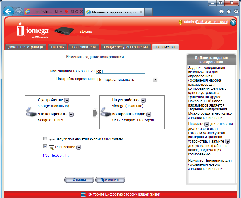 Но при необходимости пользователь может сам запрограммировать нужное число заданий. При этом в качестве источника и получателя могут выступать как локальные диски, так и сетевые ресурсы (SMB/CIFS или rsync). Выбрать нужные данные можно с точностью до директории. Каждое из заданий можно связать с кнопкой на корпусе iConnect или установить для него расписание работы. Получается, что даже без установки специального программного обеспечения на клиентские компьютеры, можно обеспечить создание копий документов с них только с использованием рассматриваемой модели сетевого накопителя.