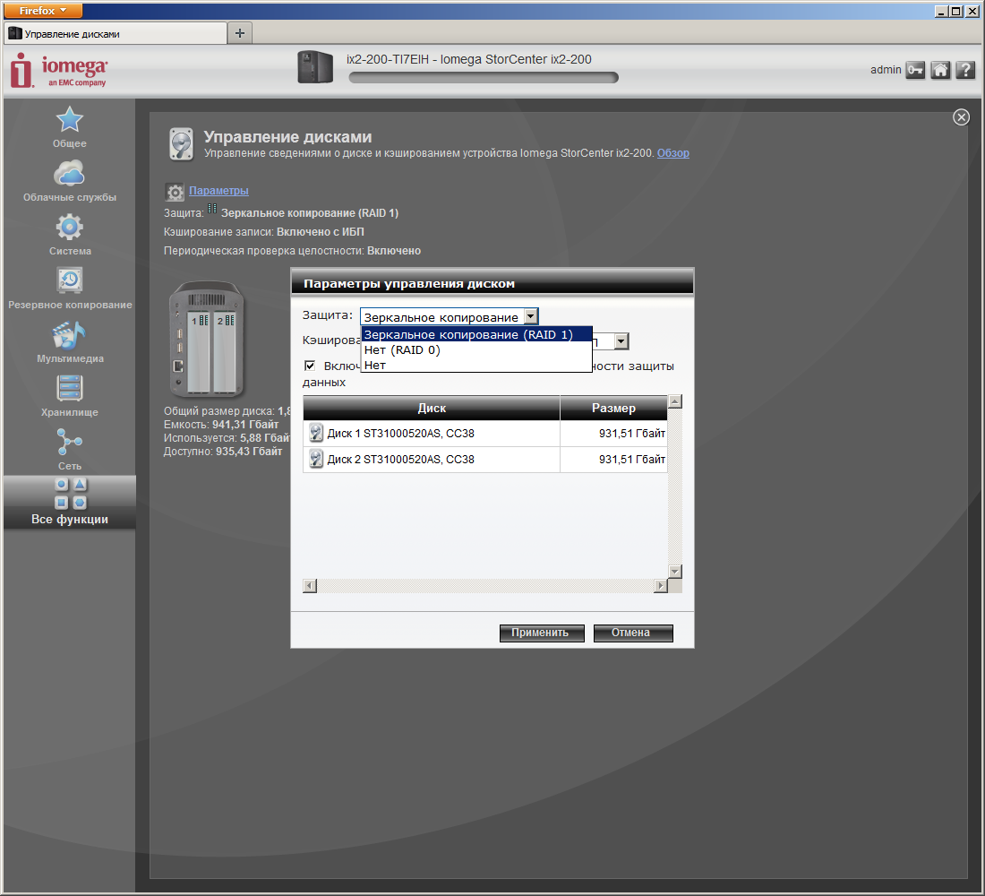 Управление конфигурацией дисковых массивов позволяет выбрать один из режимов — JBOD, RAID0, RAID1. При изменении режима работы данные пользователя не сохраняются. По умолчанию в случае отсутствия ИБП функция кеширования записи отключена. Устройство не позволяет просматривать состояние S.M.A.R.T. и проверять температуру дисков. В случае отсутствия активности, накопитель умеет отключать питание дисков.