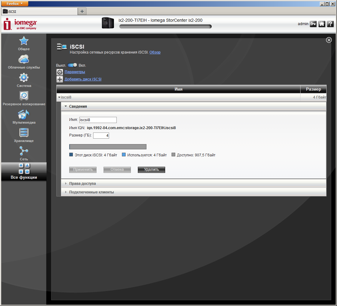 Кроме RAID, накопитель можно использовать для работы с томами iSCSI, что может быть востребовано в некоторых задачах. Они создаются на уже существующем разделе, поддерживают контроль доступа, допускают увеличение размера в процессе эксплуатации.