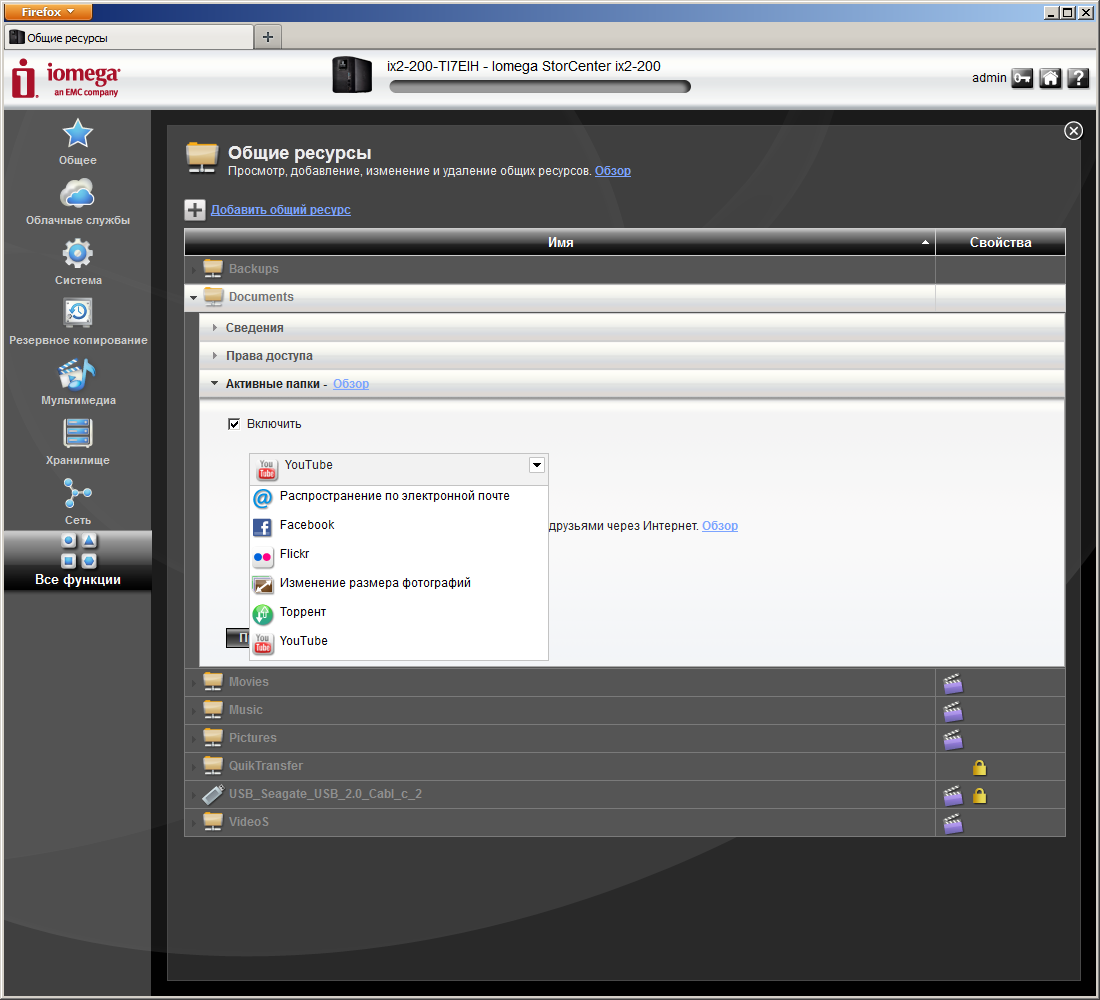 При создании сетевой общей папки указывается имя, права доступа, необходимость включения ее в индекс медиасервера и настраивается функция «Активные папки». Она позволяет выбрать для ресурса одну из нескольких дополнительных задач, которые будут запускаться при появлении в ней новых файлов: публикация фотографий на Facebook или Flickr, отправка документов по электронной почте, изменение размера фотографий, публикация видеороликов на YouTube, запуск torrent-загрузок.