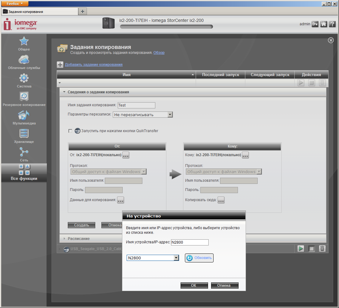 Встроенная функция резервного копирования работает с локальными общими папками, внешними накопителям и сетевыми ресурсами CIFS и rsync. Она может обеспечить автоматический бекап данных с ПК без установки на них дополнительных программ (хотя могут быть проблемы с открытыми файлами). Заданий можно запрограммировать сразу несколько, для каждого можно указать расписание работы (выбрать дни недели и задать время), а также привязать их запуск к кнопке QuickTransfer на корпусе устройства.