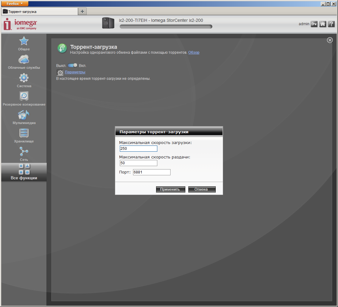 Встроенный клиент загрузки файлов по протоколу BitTorrent работает совместно с технологией «Активные папки». Запуск новых задач осуществляется записью нужных torrent-файлов в выбранную директорию. В дальнейшем можно управлять заданиями через web-интерфейс. Возможностей не очень много: установка на паузу, запуск, удаление, просмотр информации о задании. После загрузки файлы продолжают раздаваться до удаления задачи. Настройки в клиенте минимальные: ограничения скоростей загрузки и отдачи (максимум — 2 МБ/с), выбор номера порта. Учитывая производительность аппаратной платформы, мы бы не рекомендовали загружать устройство большим количеством заданий.