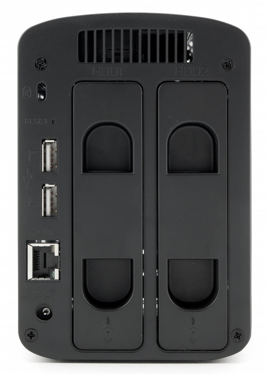 Отсеки для установки винчестеров находятся сзади. Рядом с ними — еще два порта USB, сетевой порт со встроенными индикаторами, вход блока питания и скрытая кнопка сброса.