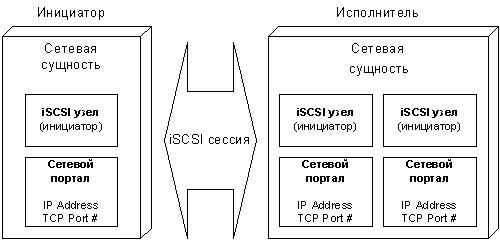 Так как iSCSI устройства являются участниками IP сети, они имеют индивидуальные Сетевые Сущности (Network Entity). Сетевая Сущность может содержать одних или несколько iSCSI Узлов.