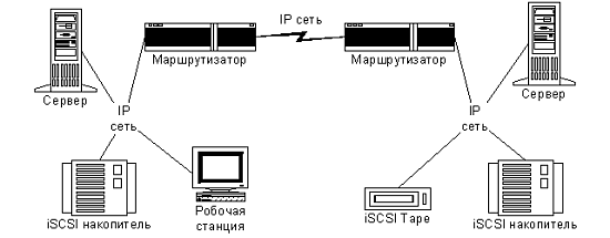 В примере, изображенном на рисунке 1, каждый сервер, рабочая станция и накопитель поддерживают Ethernet интерфейс и стек протокола iSCSI. Для организации сетевых соединений используются IP маршрутизаторы и Ethernet коммутаторы.
