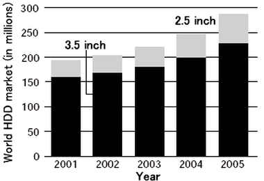 Несмотря на очевидную популярность 2,5-дюймовых решений, в прошедшем году 3,5-дюймовые винчестеры по-прежнему доминировали на рынке. Согласно предварительным данным, их доля составила 81,3% (почти 179 млн. штук), оставшиеся 18,7% пришлись на жесткие диски форм-фактора 2,5 дюйма и менее (около 41 млн. штук). Однако, как отмечают аналитики, постепенный переход на 2,5-дюймовые диски неминуем, хотя бы потому, что помимо массового использования в бытовой электронике, такие винчестеры оптимальны для работы в ноутбуках, которые уже сейчас в некоторых странах значительно популярнее обычных настольных ПК, а также в столь популярных нынче экономичных blade-серверах.