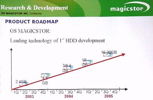 Дальнейшие планы компании способны вызвать восхищение: уже во второй половине 2004 года GS Magicstor намерена начать поставки 1-дюймовых винчестеров емкостью 7 Гб — 8 Гб, в начале 2005 года — 10 Гб моделей и ближе к концу 2005 года — жестких дисков емкостью 16 Гб — 20 Гб. Что касается объемов производства, то в 2004 году планируется поставить порядка 5 млн. 1-дюймовых винчестеров.