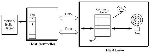Как известно, при использовании Native Command Queuing контроллер анализирует запросы от процессора и переставляет их в очередь на выполнение таким образом, чтобы максимизировать скорость передачи и минимизировать время поиска. Кроме того, контроллеры жестких дисков Serial ATA II должны уметь самостоятельно организовывать очереди запросов и выполнять их без какого-либо вмешательства процессора. Механизм работы Serial ATA Native Command Queuing в общих чертах схож с организацией очереди команд интерфейса SCSI, но в отличие от 256-уровневой глубины у SCSI, поддерживает очередь до 32 команд.