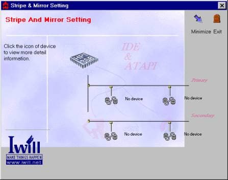 Берем очень мне нравящуюся компанию HighPoint. Идя в русле современных тенденций, они сделали чип HPT 368. По всей информации — лучше не бывает. Поддерживает горячую замену дисков (!), работает при частоте шины PCI до 44 MHz (напомню, что Promise специально оговаривал, что нестандартные частоты шины чипом не поддерживаются), реализованы режимы RAID0, RAID1 и RAID0/1. Далее, не менее уважаемая компания Iwill сделала плату на этом чипе. Красивая коробка, красочная инструкция, шлейфы с бирочками Iwill. Более того, разъем второго канала IDE продублирован на внешней «заглушке» платы, что, видимо, должно помогать при резервном копировании. Вставляй в компьютер и радуйся! Я и радовался… пока вставлял. Дальше началась суровая правда жизни… Ну, то, что наклейки на дисках перепутаны и диск с утилитами на самом деле содержит драйвера и наоборот — это мелочи. Но это далеко не все. Во-первых, про горячую замену в описании платы уже не было ни слова, во-вторых, внешний разъем оказался достаточно бесполезен — господа не озаботились тем, откуда будет браться питание, в третьих, оказалось, что данная плата в принципе не поддерживает распределенный массив данных (stripe, он же RAID0) на четырех дисках. Ну не умеет, и все тут! Только на двух дисках master!!! Ладно, это мы еще пережили. Пережили даже то, что поставляемый с платой софт (Disk Array utility) имеет красивый интерфейс, но абсолютно бесполезен.