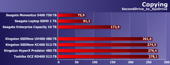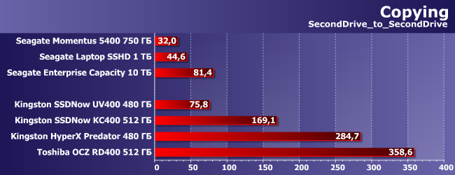 А что будет, если постараться избежать таких нежелательных ограничителей, как скорость одного из устройств в паре? Не стоит надеяться, что скорость копирования в пределах одного скоростного накопителя вдруг вырастет в разы — в этом случае сдерживающими факторами могут уже оказаться производительность процессора или, тем более, ограничения операционной системы. В итоге Toshiba OCZ RD400, который при потоковой записи данных одновременно с чтением (что как раз похоже на копирование внутри раздела) легко переваливал за 1,3 ГБ/с, при реальном копировании кучи разных файлов продемонстрировал лишь 25% от достигнутого ранее. В итоге он, конечно, все равно оказался самым быстрым из протестированных, но даже SSD с интерфейсом SATA обогнал всего вдвое. Ну а медленный SSD (причем даже не самый медленный), как видим, может отстать в этом тесте и от лучших винчестеров. Понятно, что это сильно упрощенный сценарий использования, а покупают эти накопители совсем для другого, однако не стоит удивляться итогам. Скорость последовательной записи у этих накопителей невысока, превысить ее в принципе могут уже и некоторые модели портативных внешних винчестеров, что наверняка будет шоком для владельца: он купил быстрый (в целом) накопитель, а скорость копирования вдруг упала :)