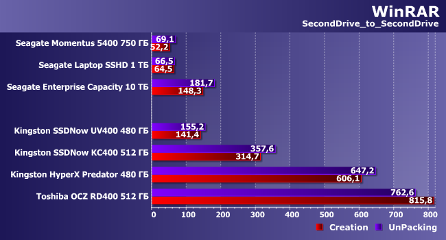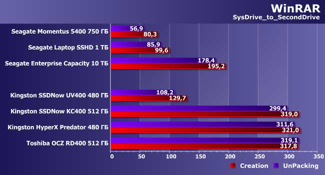 Скорость создания архива из большого числа файлов оказывается немного выше — ведь это просто потоковая запись без постоянной модификации служебных данных файловой системы. Обратная же операция больше похожа на копирование, что понятно. Впрочем, для быстрых и очень быстрых накопителей обе эти операции оказываются «легкими» и сильно зависят от скорости источника. На медленных же небольшие различия есть, причем иногда не в пользу бюджетных SSD.