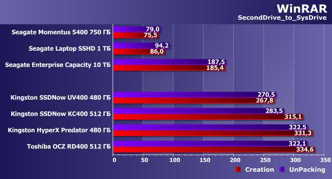 Какие накопители мы использовали в качестве вторичных? Во-первых, три винчестера: медленный ноутбучный Seagate Momentus 5400 750 ГБ (пластины по 375 ГБ со скоростью вращения 5400 об/мин), более быстрый гибридный (хотя в наших тестах эта технология ничего не дает) Seagate Laptop SSHD 1 ТБ (пластины по 500 ГБ при тех же 5400 об/мин) и топовый Seagate Enterprise Capacity емкостью 10 ТБ («гелиевая» модель на пластинах диаметром 3,5″ со скоростью вращения 7200 об/мин). Во-вторых, нами были также использованы четыре твердотельных накопителя: медленный бюджетный Kingston SSDNow UV400 (480 ГБ TLC-памяти и контроллер Marvell 88SS1074), относящийся примерно к среднему классу Kingston SSDNow KC400 (512 ГБ MLC и Phison PS3110-S10), самый быстрый (благодаря контроллеру Marvell 88SS9293 с интерфейсом PCIe 2.0 x4) в ассортименте этой компании HyperX Predator и «бескомпромиссный» Toshiba OCZ RD400 (NVMe-накопитель с интерфейсом PCIe 3.0 x4). В принципе, конкретные модели накопителей значения не имеют — просто нам хотелось более-менее охватить все скоростные классы, что вполне удалось, поскольку все их представители оказались под рукой. Возможно, кто-то сочтет недостатком отсутствие «десктопного» винчестера на 5400 об/мин, но, как будет показано ниже, никакой существенной информации это все равно бы не добавило.