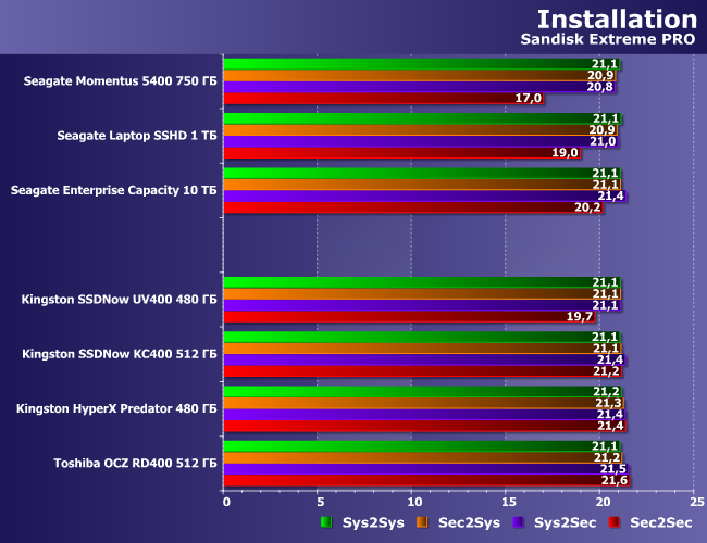 Однако, как видите, скорость накопителя может иметь хоть какое-то значение в одном и только одном случае: когда он медленный, а установка объемистого приложения производится «внутри» него (т. е. с D: на D:). Да и в этом случае величина эффекта какая-то совсем несерьезная — порядка 20% максимум. Впрочем, причина этого понятна по абсолютным скоростям: ≈20 МБ/с в состоянии обеспечить накопители любого типа, т. е. узкое место при установке приложений — вовсе не в них.