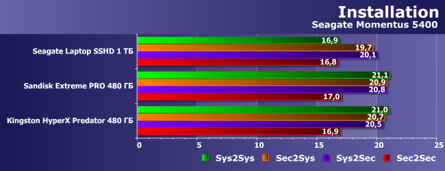 Для большей точности мы решили провести еще один тест: в качестве вторичного накопителя всегда использовали Seagate Momentus 5400 750 ГБ, меняя системный накопитель. Дополнительной информации это почти не дало, зато дало очень полезную: хоть о каком-то замедлении инсталляции можно говорить только в одном случае — когда она производится внутри одного винчестера. Если же накопителей два, то не слишком мешает даже то, что оба они механические. У SSD же этой проблемы нет вообще. Более того, «внутри» твердотельного накопителя эта операция исполняется пусть незначительно, но все же быстрее, чем в связке «SSD+HDD». Так что условно плохим случаем для инсталляции приложений можно считать только один: компьютер с одиночным винчестером. И учитывая логику работы накопителей разных типов, это легко объяснимо.