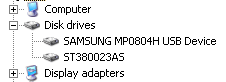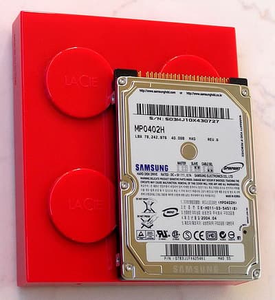Как я ни пытался, мне не удалось, не разрушив, разобрать корпус «кирпичика» LaCie — очевидно, он просто не предназначен для вскрытия потребителем. Поэтому самостоятельная замена винчестера (скажем, на более емкий или при выходе его из строя) может вылиться в некоторую проблему и повлечь за собой порчу/слом боковых пластиковых стенок корпуса. В результате, о его внутренностях можно только догадываться. К счастью, при USB-подключении в Windows этот накопитель определяется по модели используемого в нем диска — Samsung MP0804H: