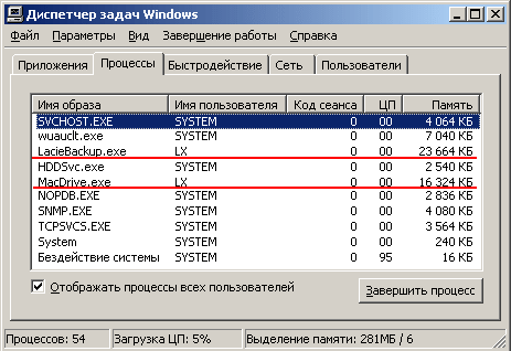 После инсталляции пакета ПО в памяти операционной системы возникнут резиденты, отслеживающие активность накопителя и предлагающие различные дополнительные сервисы. Резиденты эти весьма прожорливы до системной памяти в режиме, когда накопитель LaCie подключен, но сжимаются в памяти до 1-2 Мбайт, если накопитель отключить.