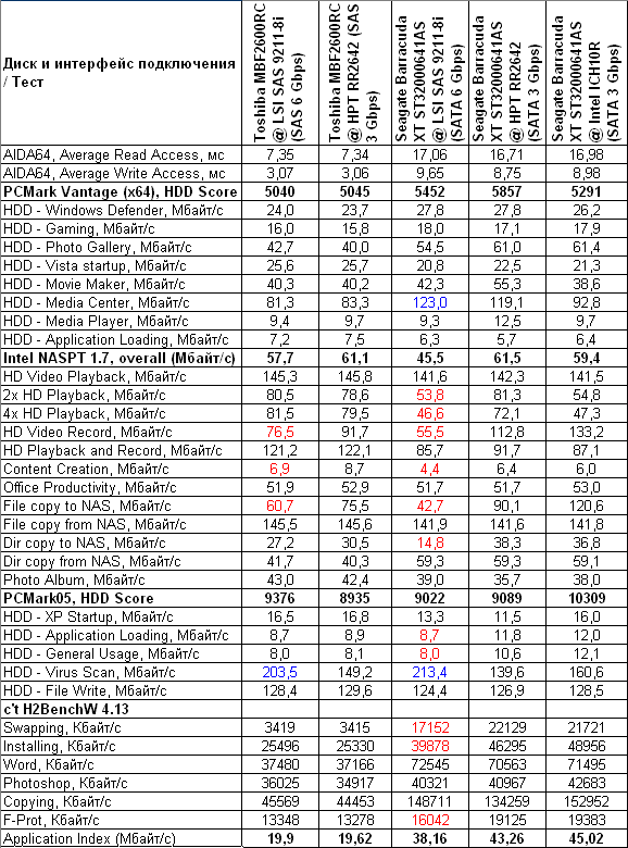 Справедливость, наконец, торжествует — серверный диск Toshiba MBF2600RC более чем вдвое опережает настольный Seagate ST32000641AS с той же линейной скоростью чтения/записи. Более того, налицо положительная разница от применения контроллера LSI SAS 9211-8i с 6-гигабитным интерфейсом. Посмотрим, из чего же складывается этот успех?