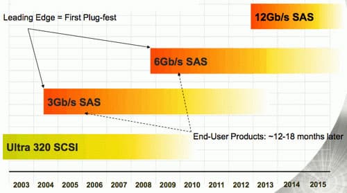 Будучи наследником старого доброго параллельного интерфейса SCSI, интерфейс Serial attached SCSI (SAS) изначально задумывался с прицелом на поэтапное удвоение пропускной способности. Первое поколение SAS со скоростью передачи данных 3 Гбит/с появилось в лабораториях еще в 2004 году и широко вышло на рынок в 2005—2006 годах. Спустя «пятилетку», то есть в 2009 году, на-гора был выдан SAS-2 (6 Гбит/с) — устройства с его поддержкой поступили в продажу уже в 2010 году. Наконец, в конце 2012 года индустрия ожидает первых инженерных воплощений SAS-3 со скоростью передачи уже 12 Гбит/с. На рынке устройства с поддержкой третьего поколения SAS следует ждать не ранее 2014 года (см. рис.). Таким образом, у новенького SAS-2 есть как минимум года четыре на окупаемость и «снятие сливок».