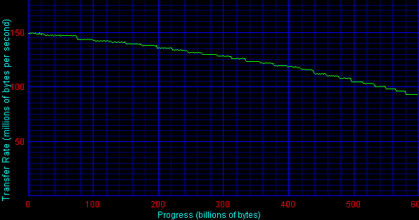 Максимальная скорость последовательного чтения/записи полезных данных для Toshiba MBF2600RC составляет около 150 МБ/с (см. график).