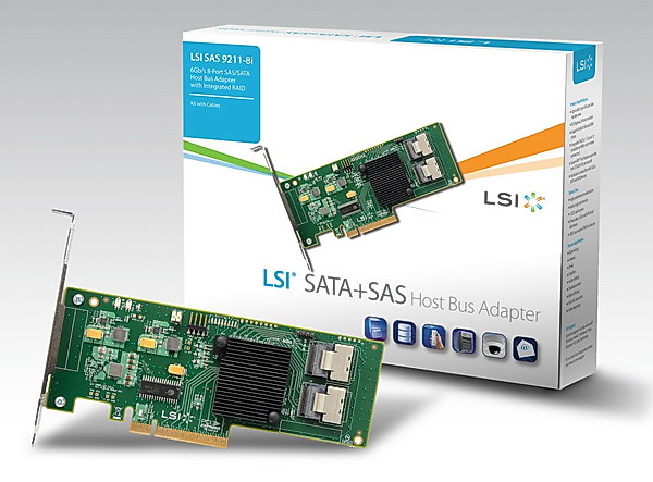 Плата LSI SAS 9211-8i имеет низкий профиль (форм-фактор MD2), оснащена двумя внутренними разъемами Mini-SAS 4X (каждый из них позволяет подключать до четырех SAS-дисков), рассчитана на шину PCI Express x8 2.0 и поддерживает простейшие RAID-массивы уровней 0, 1, 1Е и 10, а также динамическую функциональность SAS, включая dual-port drive redundancy, может работать в общей сложности с 256 физическими дисками SAS и SATA (свыше восьми — через порт-мультипликаторы) и мн. др.