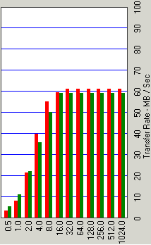 «Чехарда» со скоростью чтения и записи в зависимости от размера блока на тестовых файлах размером вплоть до 512 Кбайт (тут показана ситуация для файла 128 Кбайт, но для 256 и 512 ситуация примерно та же) для новичка немного улучшилась (особенно это заметно для записи), хотя, к сожалению, не исчезла совсем. Немного повысилась и скорость работы с самыми мелкими блоками (512 и 1024 байт), хотя до идеала все еще далеко. Начиная с тестовых файлов 1 Мбайт картинка по чтению и записи немного «выпрямляется», хотя тут же обнаруживается, что кэширование чтения практически пропало, причем скорость чтения падает ниже скорости физического носителя (не исключено, что это последствия неблагоприятной интерференции метода измерения, примененного в данном тесте, с «интеллектуальными» алгоритмами работы firmware накопителей Maxtor, хотя полученные на домегабайтных тестовых файлах картинки на удивление повторяемы и однотипны для разных дисков). Впрочем, по чтению ситуацию может замтено улучшить применение NCQ в SATA-моделях этой серии. Что же касается записи, что и на крупных тестовых файлах она явно улучшилась в плане кэширования буфером — крупные файлы эффективно кэшируются (практически до скорости интерфейса) вплоть до размеров 8 Мбайт (!), что было немыслимо для всех предыдущих поколений ATA-дисков этого и других производителей. Maxtor можно поздравить со взятием еще одного «бастиона». :)