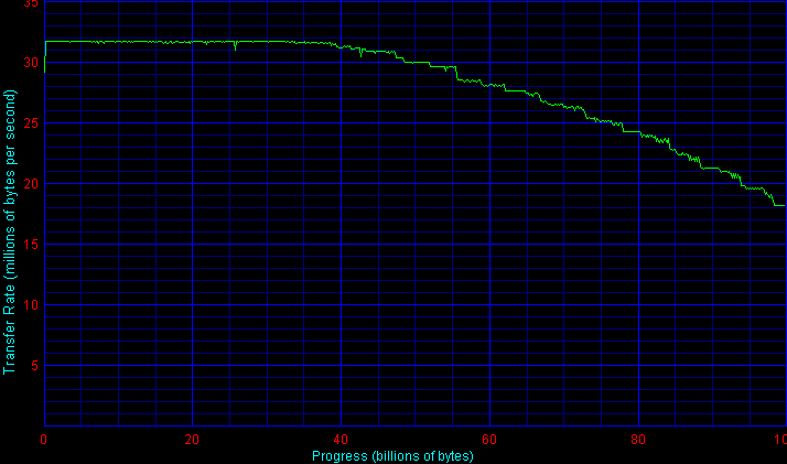 Скорость работы интерфейса Hi-Speed USB у Maxtor One Touch III Mini Edition оказалась на том же уровне, что и у контейнера Truewin NS2601, использующего чип-преобразователь той же компании. Это чуть хуже, чем у лидеров, но все же вполне достойный уровень, лучше, чем у внешних накопителей от Seagate и WD. Об этом можно судить и по графикам Transfer Rate (кликните по ним для просмотра полностью).