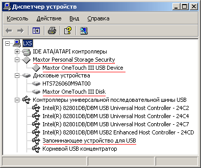 После инсталляции пакета ПО, включающего Maxtor OneTouch, Maxtor Encryption и Maxtor Backup, в Device Manager появляется дополнительный пункт Maxtor Personal Storage Security,