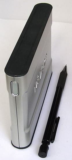Вид у Maxtor OneTouch III Mini Edition весьма стильный. Корпус из прочного пластика покрыт стойкой серебристой лакокраской (так что некоторые даже думают, что он «из алюминия» ;)) Скругленные «передок» и «задок» визуально уменьшают продольные размеры и вкупе с подобранным цветом и симметричными, но не плоскими формами делают корпус привлекательным.