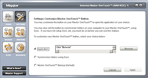 функциональное назначение кнопки OneTouch на корпусе диска (бэкапу, синхронизации папок или запуску определенного приложения)