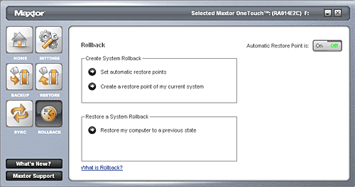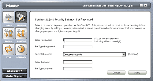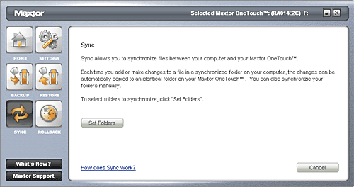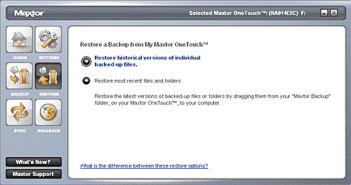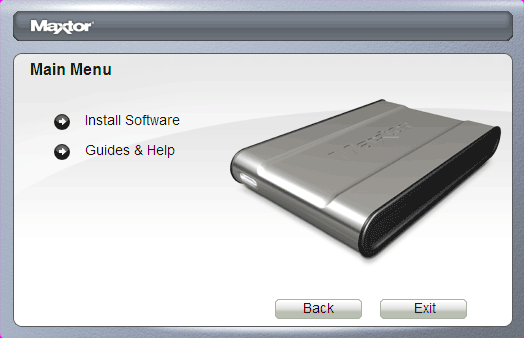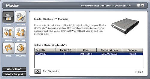 По кнопкам в нижнем левом углу меню можно вызвать техподдержку Maxtor и посмотреть свежую информацию об устройстве, если ваш компьютер подключен к Интернет.
