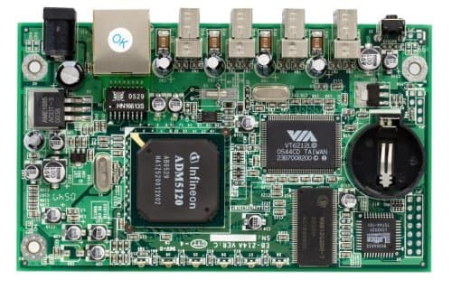 Основа EB-214A — известный специализированный процессор Infenion ADM5120. Остальные компоненты стандартные — флеш память для прошивки, чип SDRAM оперативной памяти, контроллер USB от VIA, несколько светодиодов и батарейка для хранения конфигурации при выключении питания.