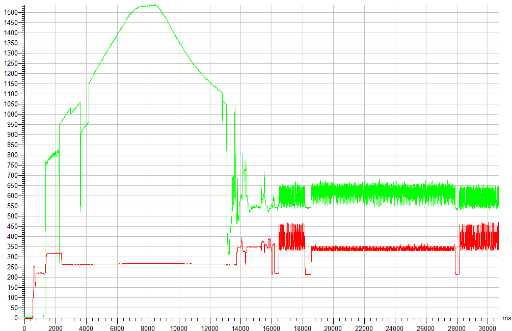 Последний график этого раздела показывает процесс старта жесткого диска при подаче на него питания. Зеленой линией обозначено потребление по шине 12 В, а красной — по шине 5 В. Задержка включения составляла 250 мс, а общий интервал записи — 30 секунд. По горизонтальной оси — время в миллисекундах, по вертикальной — ток в миллиамперах.