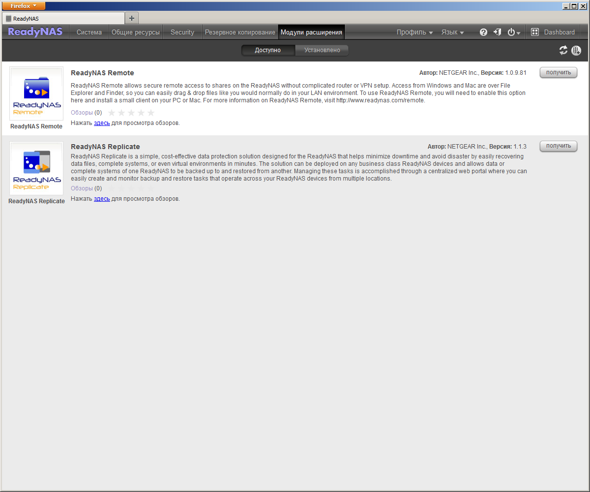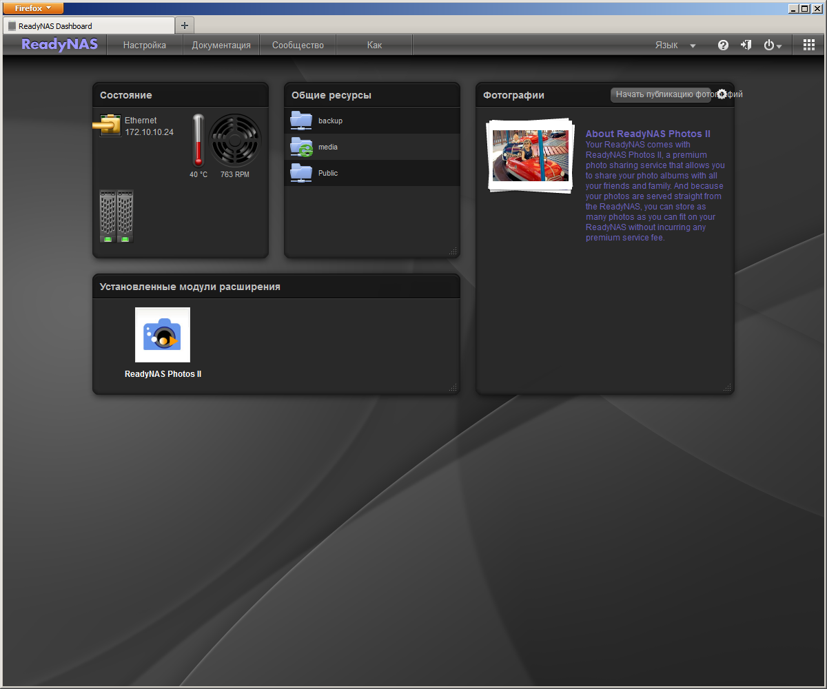 В блоке «Состояние» показывается IP-адрес, температура устройства, скорость вращения вентилятора и статус дисков (цветными «лампочками»). На наш взгляд, это слишком упрощенный вариант, но возможно, для домашних пользователей его будет достаточно. В «Общие ресурсы» можно увидеть список общих папок, но нельзя перейти к ним для доступа к файлам, что тоже странно. Многие производители реализуют сегодня модульную структуру прошивок, это позволяет заметно упростить управление функциями и обновления. Штатно в рассматриваемой модели предустановлен модуль ReadyNAS Photos II, мы поговорим о нем чуть позже.