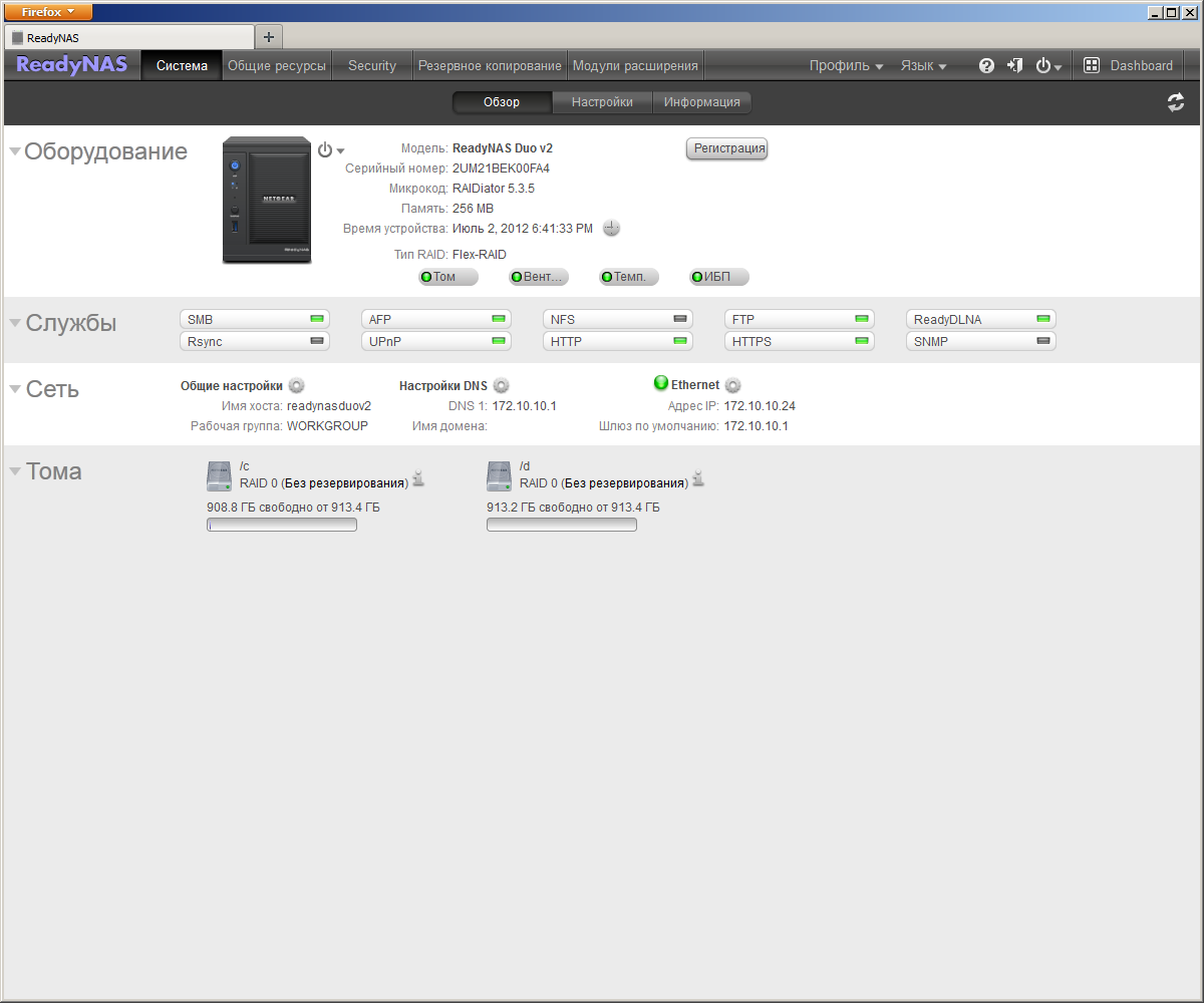 Основная группа опций — «Система» — разбита на три страницы. На первой («Обзор») приводится информация об устройстве — модель, серийный номер, дата и время, версия прошивки, состояние дискового тома, вентилятора, температурного режима. Чуть ниже находятся кнопки-индикаторы состояния сервисов и протоколов. Для доступа к данным накопитель поддерживает работу с SMB, AFP, NFS, RSync, FTP. Опции есть только у последнего — выбор номеров портов, включение анонимного доступа, разрешение докачки. Отметим, что сервером поддерживается работа с Unicode и пассивный режим. Настройки сетевого интерфейса стандартны — выбор IP-адресов (поддерживается и DHCP), имени устройства и названия рабочей группы. Отметим, что с Jumbo Frames накопитель не работает. В накопителе дополнительно реализованы протоколы UPnP и SNMP. Изменение параметров осуществляется выбором иконок, но первое время пользователь будет путаться, поскольку они не стандартизированы. Например, знак «часы» вызывает окно настроек встроенных часов, тогда как для сетевых опций используется «шестеренка».
